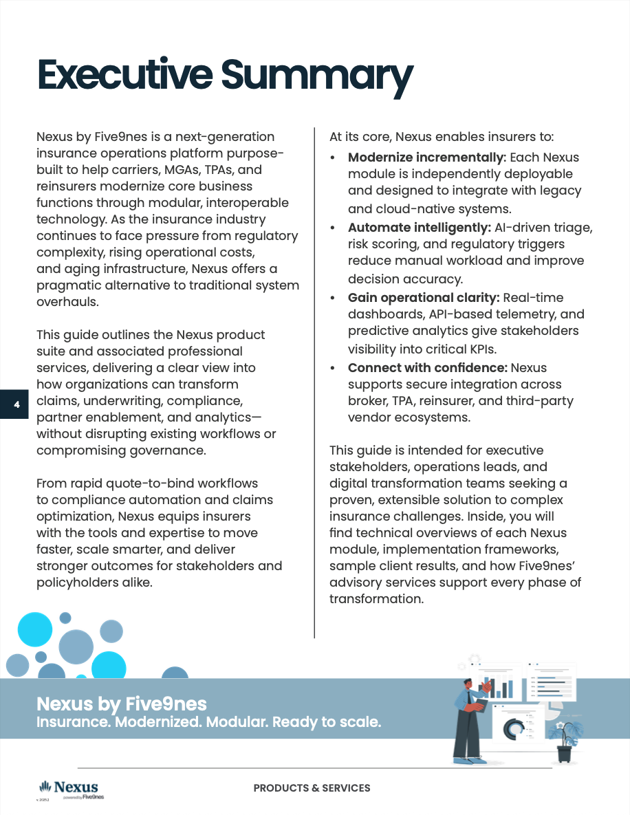 Nexus by Five9nes, a next-generation insurance operations platform purpose-built to help carriers, MGAs, TPAs, and reinsurers modernize core business functions through modular, interoperable technology.